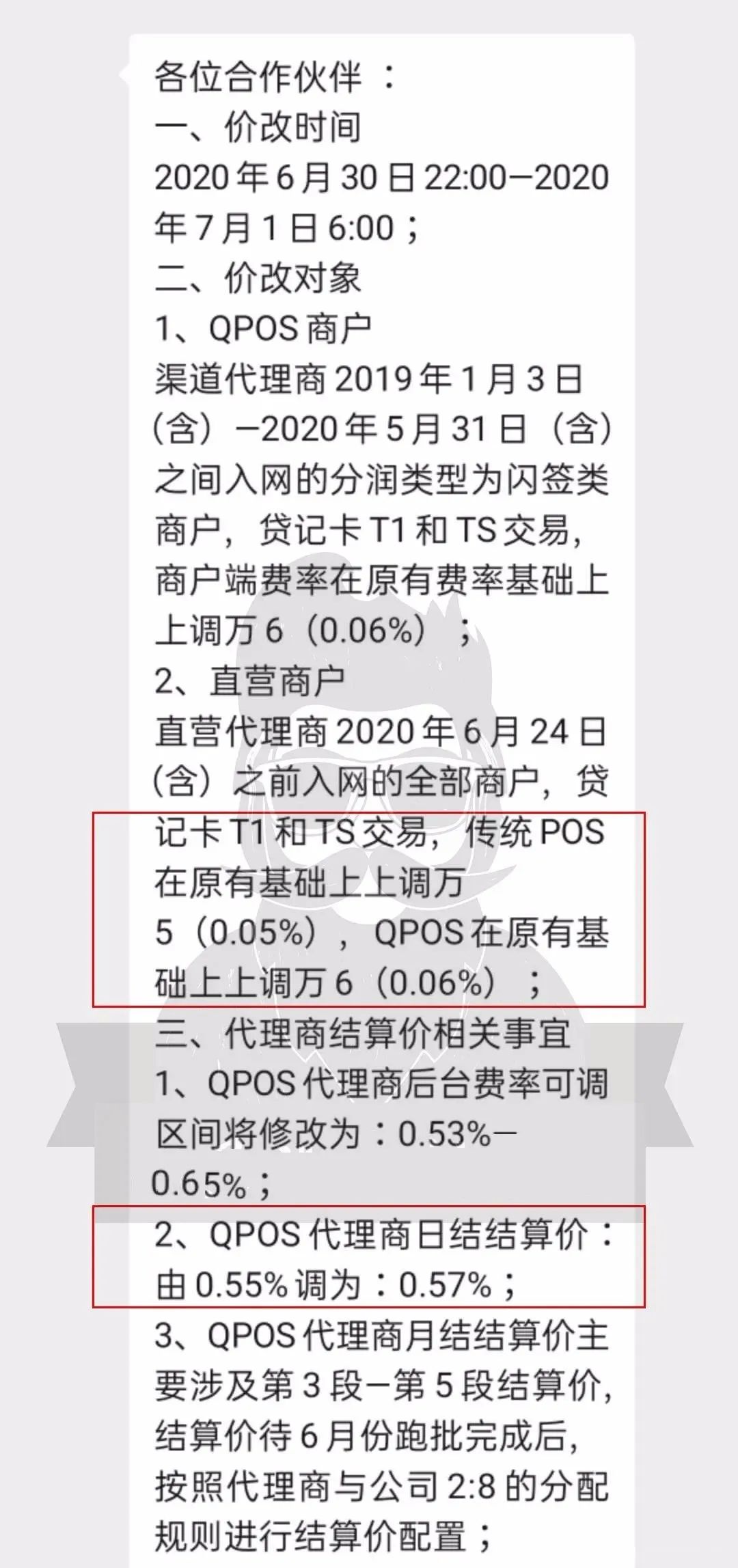 針對渠道商,5月31日前激活的商戶,海科Q POS漲萬6費率+萬2結算價;針對直營代理商,6月24日前入網激活的商戶,海科傳統POS漲萬5費率、Q POS漲萬6費率+萬2結算價。