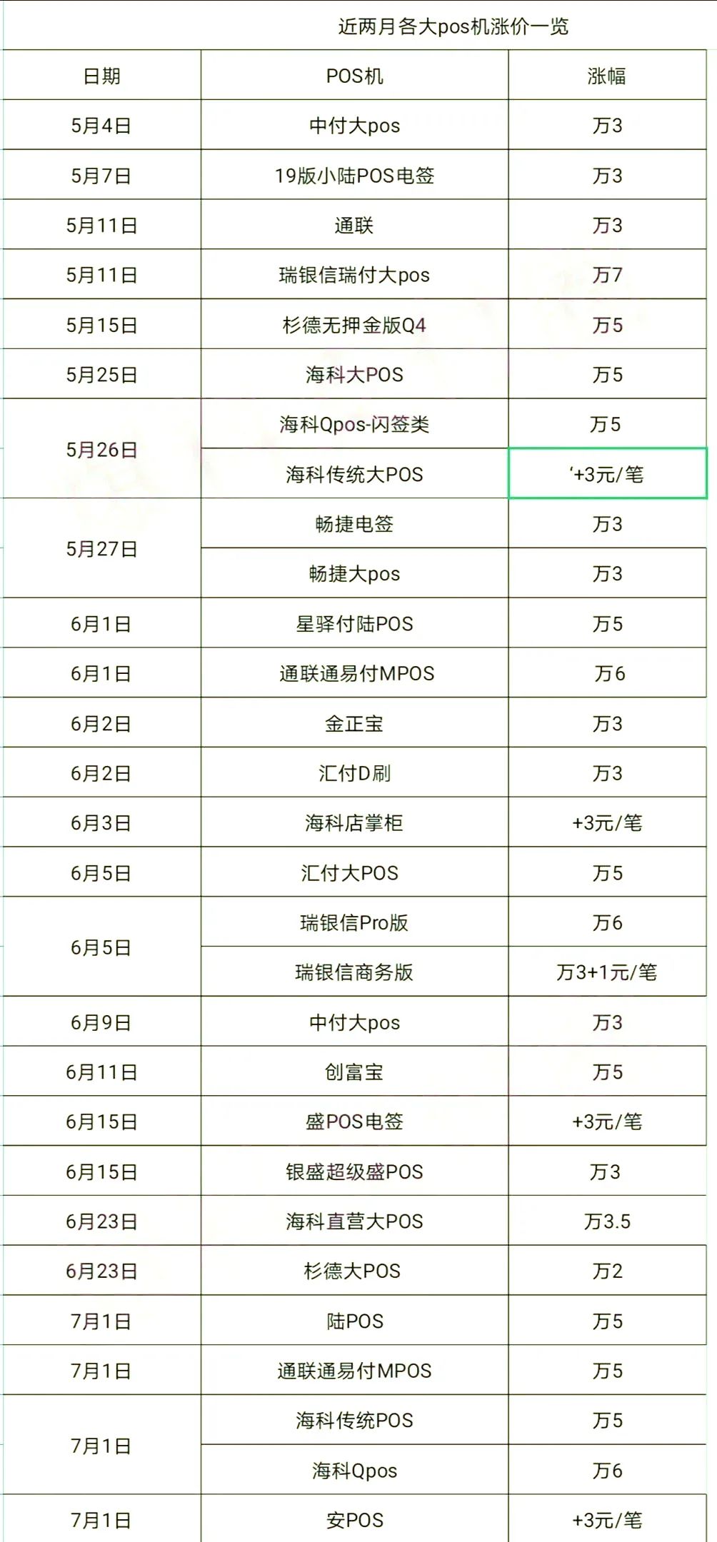 事實(shí)上,自5月份以來已經(jīng)有一大波支付機(jī)構(gòu)陸陸續(xù)續(xù)上調(diào)了費(fèi)率。以下是近兩個月各支付機(jī)構(gòu)POS終端費(fèi)率上調(diào)一覽表: