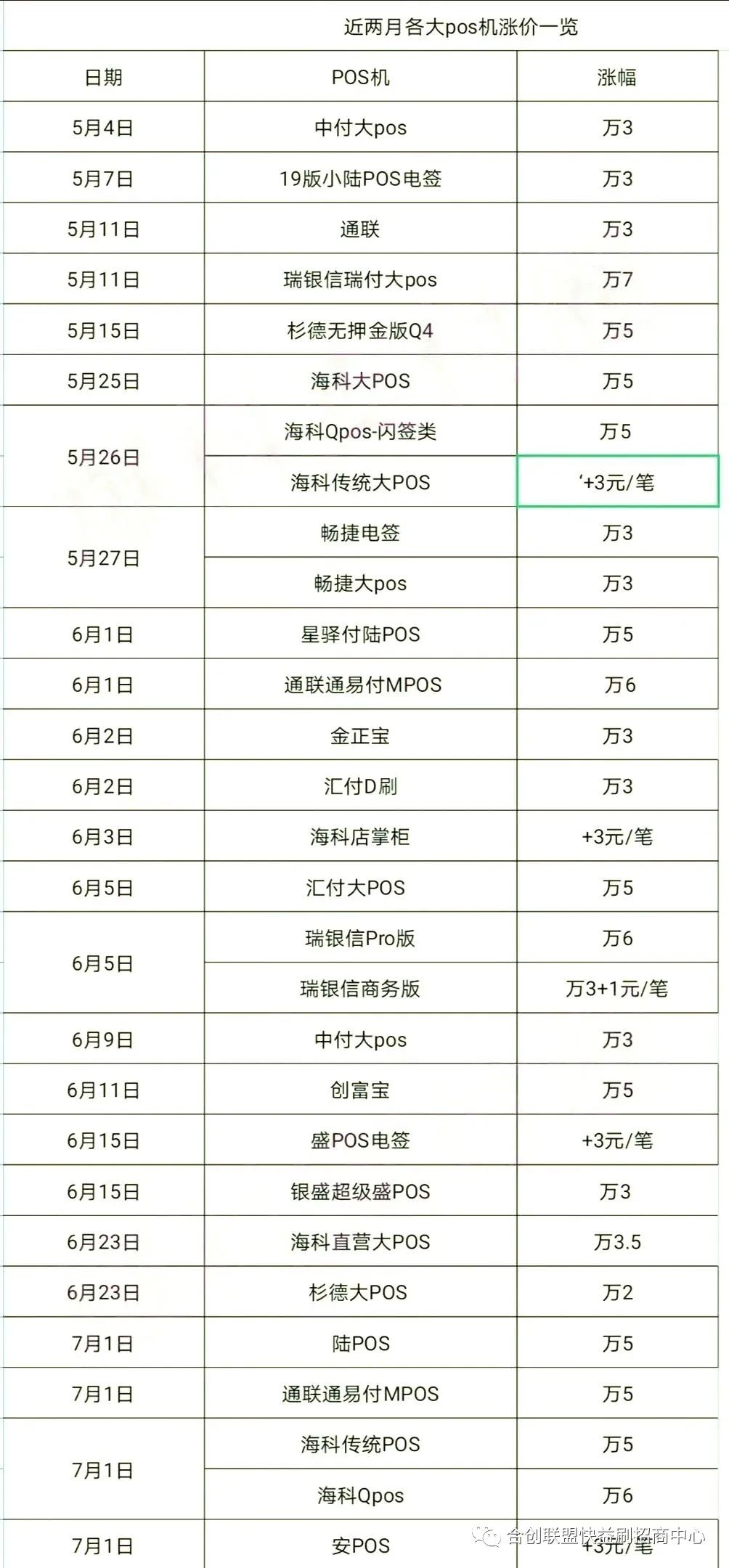 一波未平一波又起,早幾天前,通聯(lián)的通易付代理商結(jié)算價才偷偷上漲了萬5,之后各POS機(jī)的品牌也紛紛加入這漲價大軍:海科Qpos漲萬6、傳統(tǒng)POS漲萬5等等。