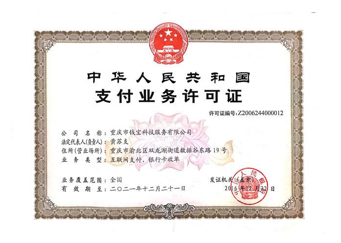 重慶市錢寶科技服務有限公司產品,2011年獲得中國人民銀行頒發的“支付業務許可證”,擁有全國性“銀行卡收單”和“互聯網支付”兩項牌照,國內首批通過Visa QSP資質認證的持牌機構。