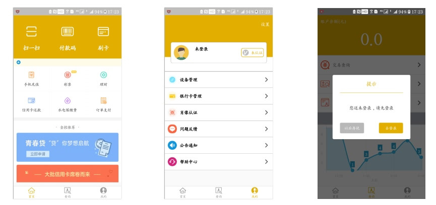 1、 商戶打開APP提示登錄,不用登陸即可查看標簽頁,但如果點其中功能項,則會提示登錄