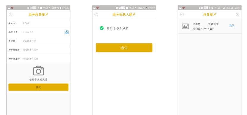 商戶使用注冊手機號和秘鑰登錄后,點主頁功能按鈕會提示添加結(jié)算賬戶,點【確認】后,會跳轉(zhuǎn)到添加結(jié)算賬戶頁面。賬戶名取注冊姓名,拍銀行卡正面照自動填卡號、再輸入開戶信息,即可添加結(jié)算賬戶,首個結(jié)算賬戶為默認賬戶