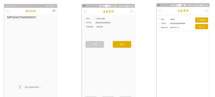 1、商戶添加結(jié)算賬戶后,點主頁功能按鈕仍會提示綁定設(shè)備,點【確認】后,會跳轉(zhuǎn)到綁定的藍牙掃描頁面。此時打開MPOS設(shè)備電源,再點擊掃描搜索到的MPOS設(shè)備藍牙名,點【綁定】即可完后才能綁定設(shè)備操作。