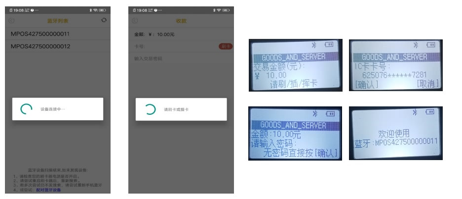 2、【確認提交】后,APP會掃描鏈接直簽交易開始選擇SN的設(shè)備,并在MPOS設(shè)備上提示請刷/插/揮卡。完成刷/插/揮卡后,MPOS設(shè)備上確認卡號、輸入密碼,點設(shè)備上【確認】按鈕后,MPOS顯示待機頁面時則處理完成,跳轉(zhuǎn)APP上輸入簽名。