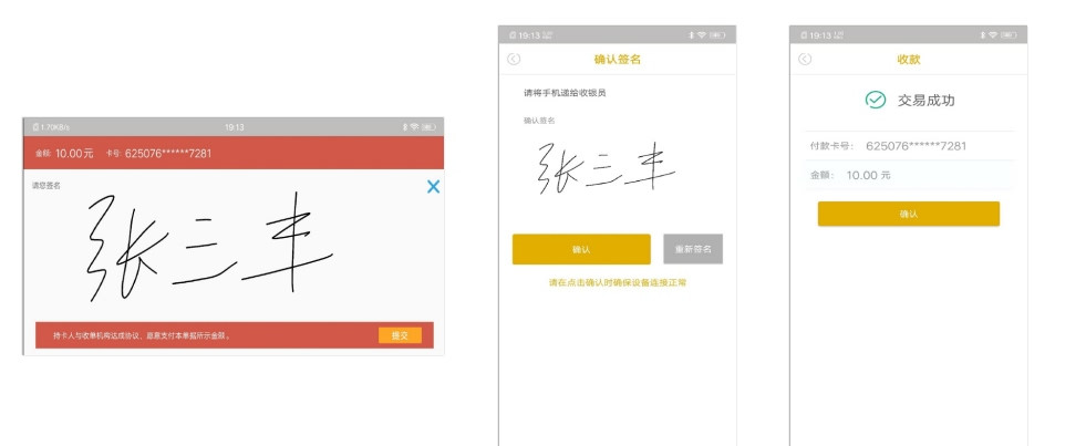 五、APP提示簽名后,需要把手機橫屏進行手寫簽名,提交后豎屏進行確認或重新簽名,點【確認】后,提交交易信息到支付系統(tǒng),立即返回交易結(jié)果,點【確認】返回APP主頁,整個銀行卡交易完成。