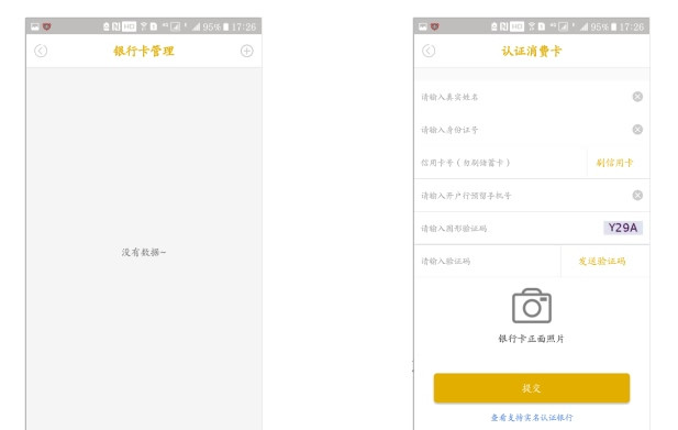 未認證的磁條卡不能刷卡交易,需要在“我的”標簽頁中進行【磁條卡認證】,顯示已經(jīng)認證通過的磁條卡列表,點+號打開新磁條卡認證頁面,輸入姓名、身份證號、銀行卡號、手機號以及驗證碼,點【提交】,立即回提示認證結(jié)果。