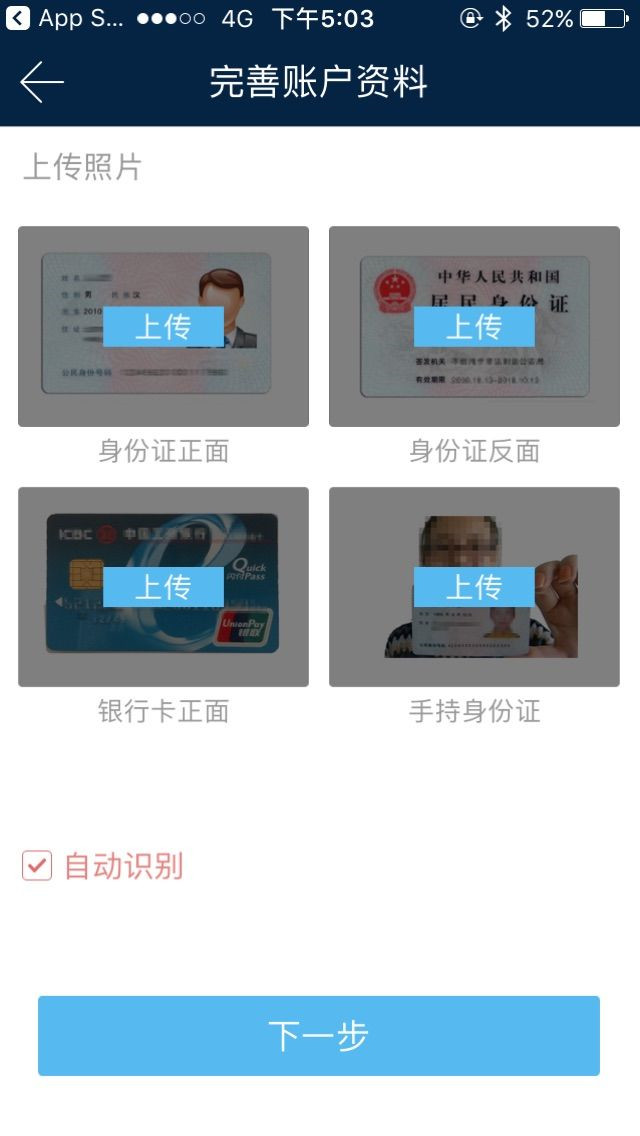 身份證正面照片、身份證反面照片、手持身份證照片、銀行卡正面照片、活體驗證(下載APP即可注冊,要體驗產(chǎn)品功能需完善資料)提交的資料需要按照示例的照片提交,照片上的信息要完整清晰,符合規(guī)范;(注冊只支持身份證或臨時身份證注冊)